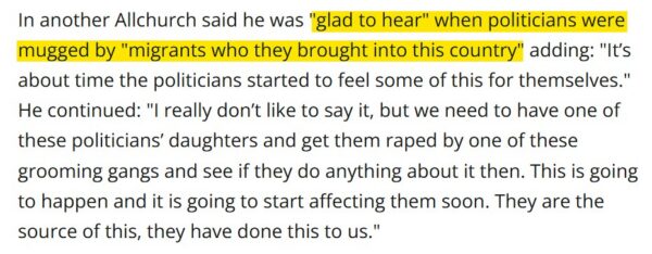 Also, “I really don’t like to say it, but we need to have one of these politicians’ daughters and get them raped by one of these grooming gangs and see if they do anything about it then.”