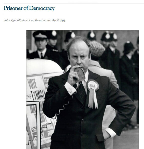 It’s all so tiresome. In 1993, I published an article by John Tyndall about a prison sentence he and a co-defendant served in 1986 under the very same laws that sent Mr. Melia and Mr. Allchurch to the big house. He titled it “Prisoner of Democracy,” which was exactly what he was.