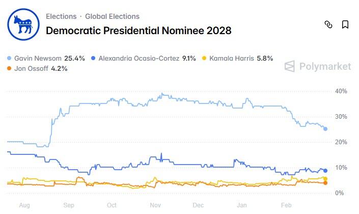 As Statista’s Valentine Fourreau reports, according to data from prediction market platform Polymarket, Gavin Newsom is currently most likely to become the Democratic nominee for the 2028 presidential election with odds of over 25 percent as of February 23, 2026.