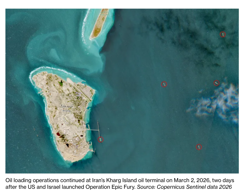 The latest from Bloomberg reports that Iran continued loading crude onto tankers at Kharg on Monday, despite U.S. and Israeli strikes on IRGC targets countrywide. It remains unclear whether the loading terminal will still be operational through the end of the week, given that the Strait of Hormuz is paralyzed and that any shadow tanker carrying Iranian crude through the chokepoint could be targeted by U.S. and allied forces.