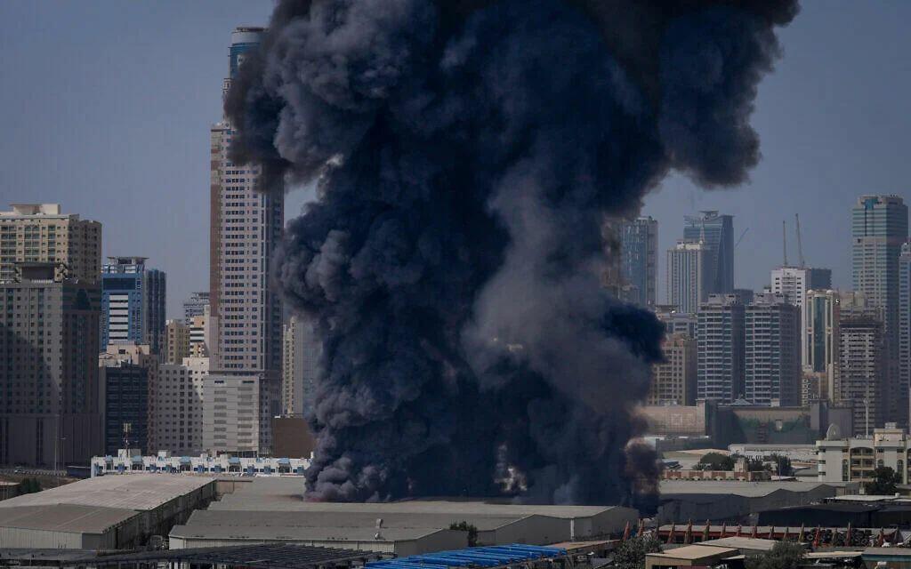 A black plume of smoke rises from a warehouse at the industrial area of Sharjah City in the United Arab Emirates following reports of Iranian strikes in Dubai, United Arab Emirates, March 1, 2026. (AP Photo/Altaf Qadri)