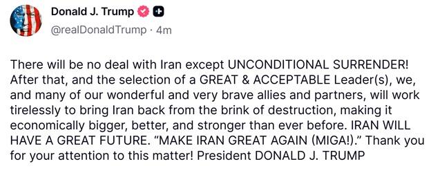 • Trump rejects negotiations amid Tehran reports that outside countries offered mediation, declaring there will be “no deal except unconditional surrender,” and suggesting Iran could later select a new leader with US approval.