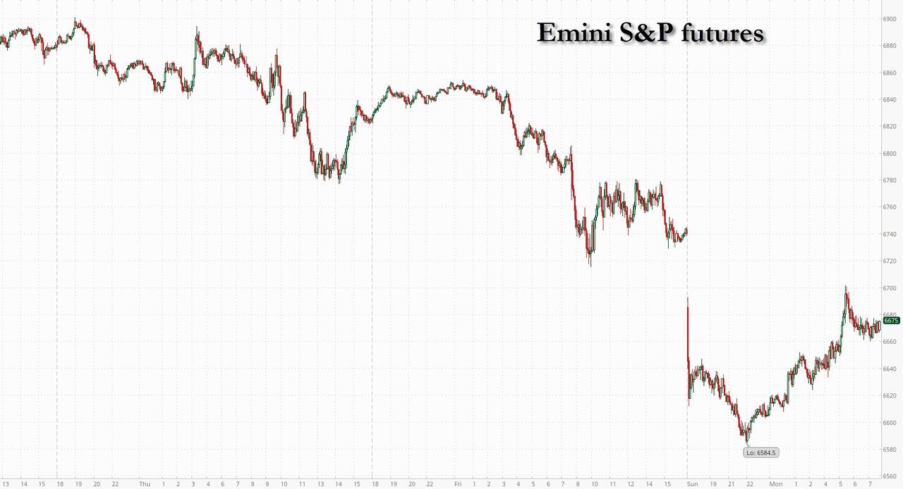 US futures tumbled and oil surged as the war in Iran showed little sign of deescalating over the weekend and led to more major Middle East producers curbing output. Still, futures retraced more than 50% off the overnight lows as WTI nearly touched $120 overnight, the highest since 2022, before dropping back to around $100 after a report G7 countries may release 300 million to 400 million barrels, or around 25% to 30% of the 1.2 billion barrels in strategic reserve. As of 8:00am ET, S&P futures are down 1%, although well off session lows, having tumbled as much as 2% earlier before the SPR news hit; in pre-market trading, Mag7 names are weaker, but certain AI plays are positive pre-mkt with Energy the standout sector and Defense bid higher, too. Generally, Defensives over Cyclicals. Bonds deepened losses while the dollar hit its highest level since January. Bond yields are higher, bear flattening, but Treasuries are outperforming global peers with European bonds in freefall due to fears of a spike in inflation driven by higher gas prices; Commodities are stronger led by Energy with all segments / sub-segments higher ex-precious metals which are being sold to fund margin calls in oil. WTI Crude futures have pared an increase of as much as 31% to about 13% but remain highest since 2022 as the war in the Middle East restricts supply via the Strait of Hormuz. Today’s US economic data slate includes February New York Fed 1-year inflation expectations at 11am. Reports ahead this week include CPI, personal income and spending (includes PCE price indexes), 4Q GDP revision, JOLTS job openings and industrial production