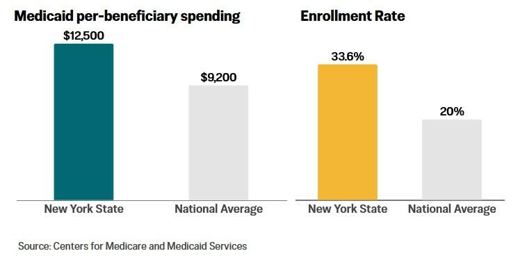 New York’s average spending on each beneficiary is more than $12,500, which is 36 percent higher than the national average. The state’s per-resident spending is the highest in the country, nearly 80 percent higher than the national average.