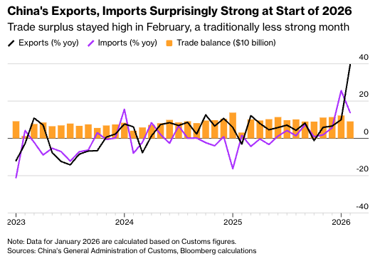 Government data showed that exports soared 22% during the period, compared with a 7.2% median estimate from Wall Street analysts surveyed by Bloomberg. Imports jumped nearly 20%, according to a statement released Tuesday by the General Administration of Customs. The trade surplus came in at $214 billion, an all-time high for the January-February period.
