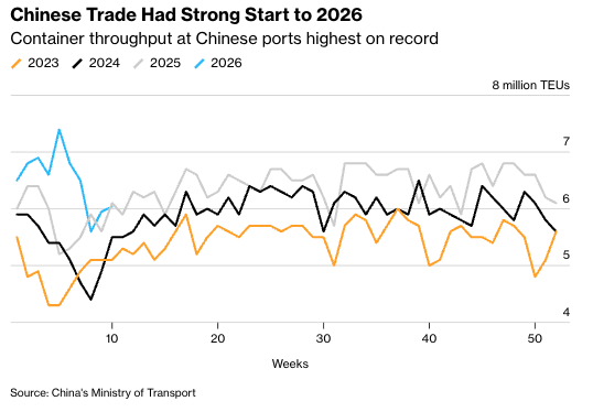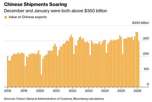 Total exports for January nearly topped $357 billion, the second-highest on record, according to Bloomberg calculations based on official data.