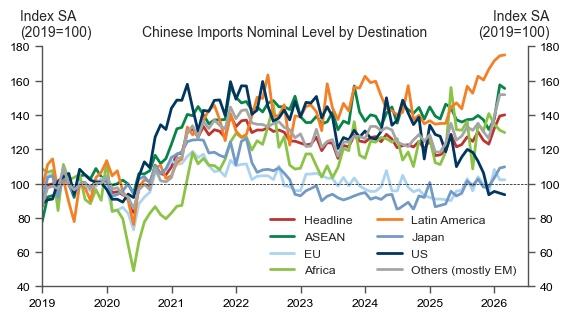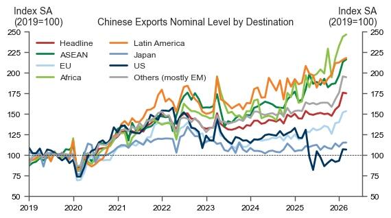 Trade flows show China is becoming less reliant on the US market. Exports to the US fell 11%, while shipments to Africa surged nearly 50%. Exports to ASEAN rose more than 29%, and shipments to the EU climbed almost 28%.