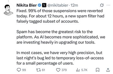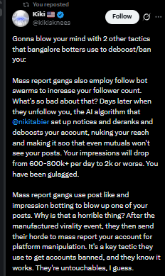 • Last night I could not live stream on X, nor upload any video despite no technical issues elsewhere. My account was locked down today for allegedly violating content policies over my header image, which had been flagged en masse by bots or paid shitters (no real user complaints).