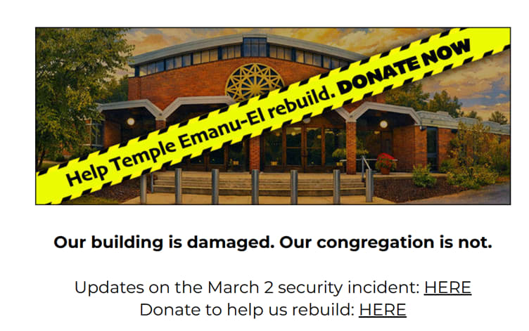 In this instance I don’t think it is the first solution because there is no obvious link to ‘anti-Semitism’ and even though Temple Emanu-El is trying to spin this free publicity into a donation drive – see the below screenshot taken from the main page of their website – (2) the truth is that in my view this is jews just being unscrupulous rather than a case of ‘Rabbi, whatcha doing?’