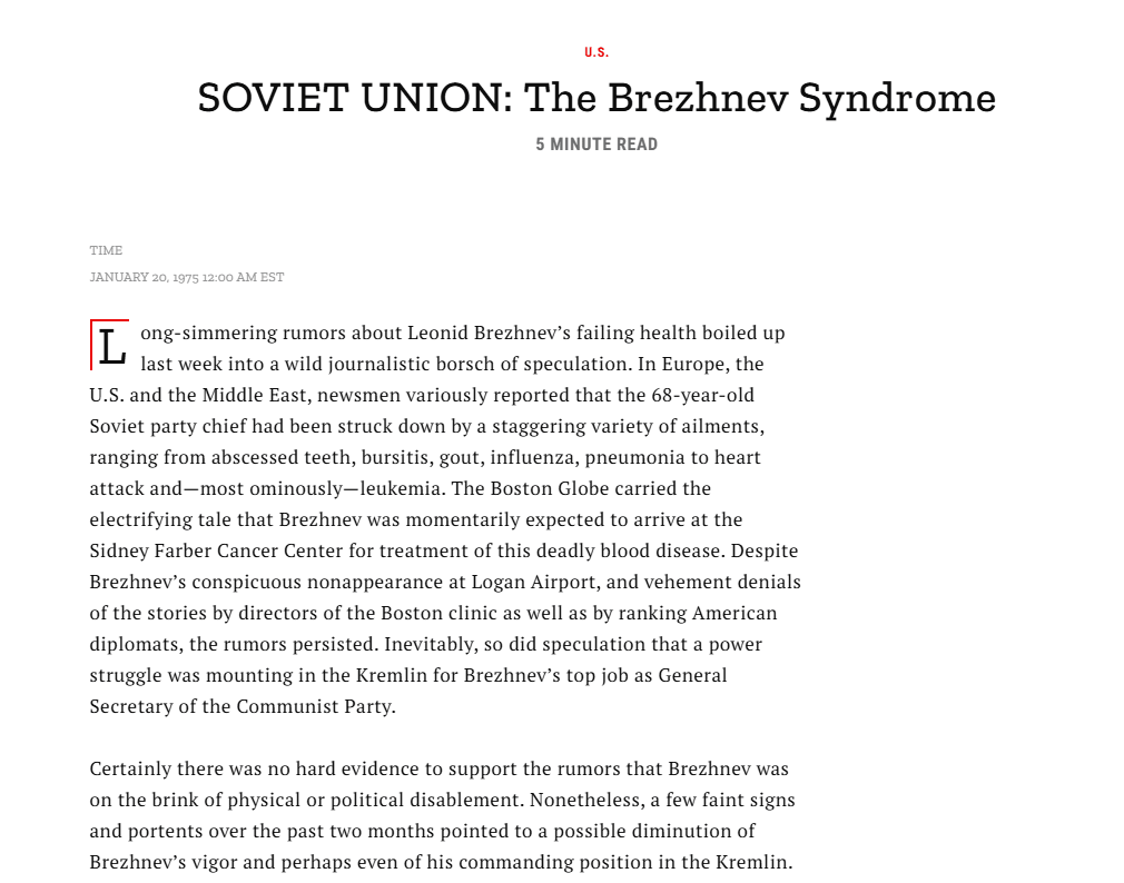We saw a softer coup in the Soviet Union force Brezhnev and most of his faction from power well before his death when his health declined… He kept his title, but by the end he was little more than a figurehead.