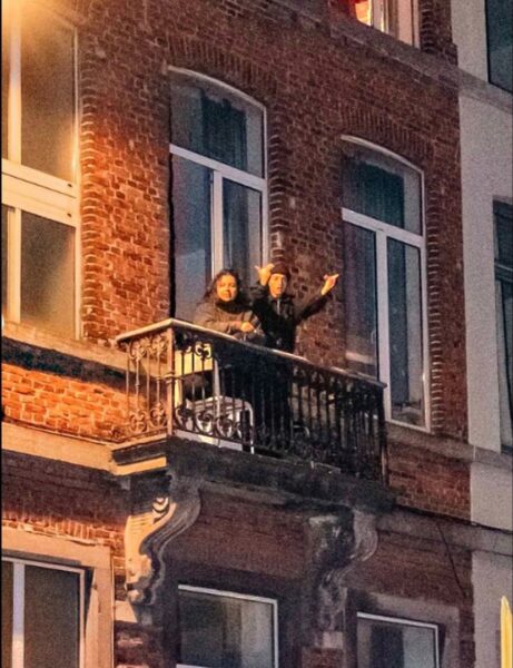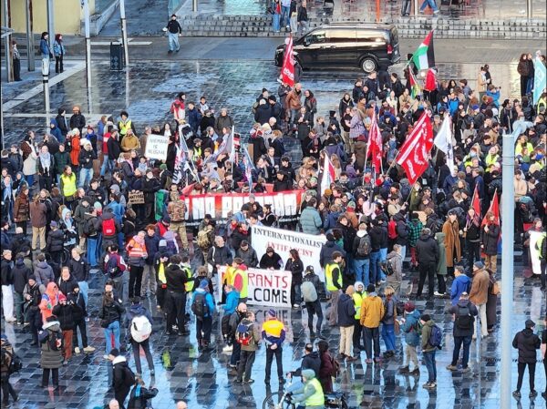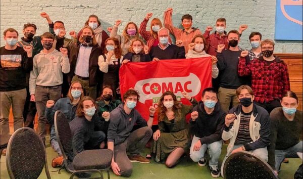Along with a Palestinian flag, and a “migrants are welcome” sign, you see a lot of red flags. They are the flag of the Belgian youth Communist group. COMAC stand for Communist Action.