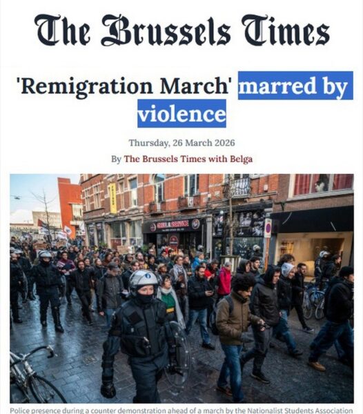 The Brussels Times also whooped about the march being “marred by violence,” but in the last paragraph came clean and admitted that every one of the 20 people arrested by the police were lefty counter-demonstrators.