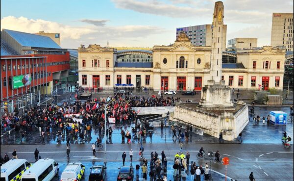 I mentioned earlier that Leuven — like all university towns, it seems — is ferociously lefty. So, of course, there was a counter-demonstration earlier in the day, which assembled in a square in front of the train station.