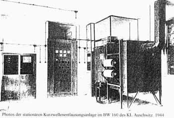 In 1944, during the final year of the war in Europe, the Germans installed and operated state-of-the-art high frequency facilities at Auschwitz to kill disease-bearing lice and other pests. These expensive installations, installed in response to the high death rate wrought by disease, worked on the same principle as the familiar microwave appliances widely used today in households around the world. These Auschwitz facilities, designed to help save lives, proved very effective.
