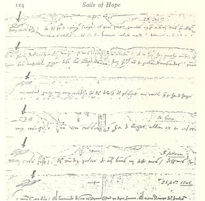 ‘Close investigation of the Columbus letters will reveal another riddle. Twelve of the letters, all of them to his son Diego, bear a peculiar sign or cipher in the upper-left hand corner. The letters in question are those of November 21, 1504, November 28, 1504, December 3, 1504, December 13, 1504, December 18 1504, December 21, 1504, December 24, 1504, February 5, 1505, February 18, 1505, February 24, 1505, and two letters without apparent date. Scholars have long noted the sign without attributing any importance to it and had taken it as a mark by the Duke of Veragua’s archivist.’ (7)