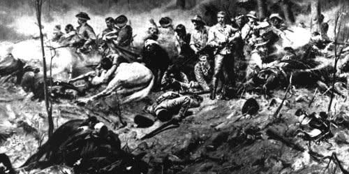 The dashing Wilson and his brave volunteers were cut off and a small clearing was found in which Major Wilson elected to make his final stand. There was no cover but there was, at least, clear fields for the Troopers to fire into. The horses, who were doomed regardless, were made to lie down and formed into an impromptu laager. The Rhodesian then crouched down behind the unfortunate creatures and prepared to sell their lives dearly. One Matabele who was present recalled: