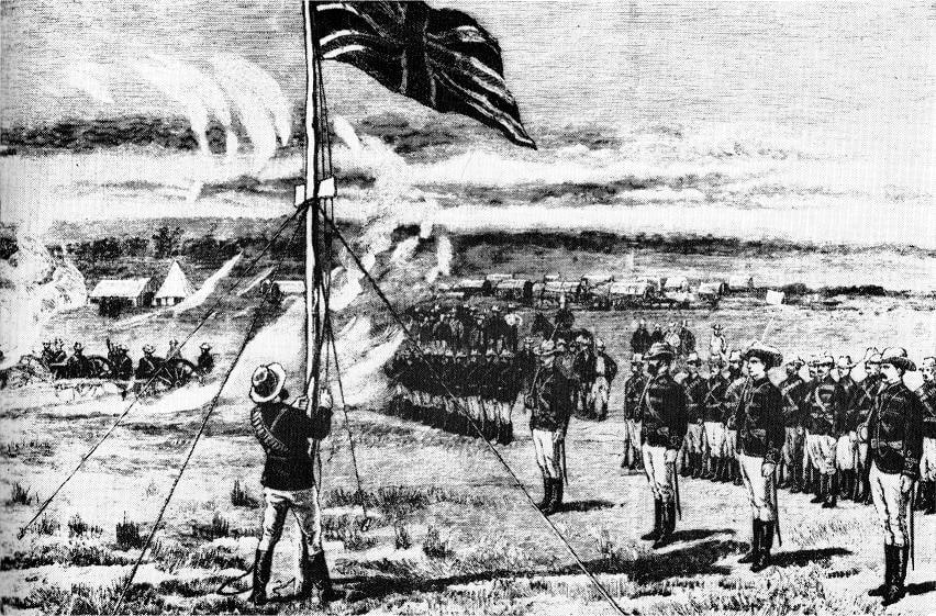 On 10 September, Colonel Pennefather and Captain Ted Burnett, the Chief Scout, rode on ahead to choose a site for fortification and settlement. A suitable site near the Makabusi River was chosen and Fort Salisbury, named in honour of the Prime Minister, was established. Two days later the main column arrived. These lands laid in the territory of the elderly Chief Harare who could only watch in bemusement as the main column came to join the duo on the 12th. On the following day, the 13th, the Union Jack was run up a flagpole by Lieutenant Edward Tyndale-Biscoe. After ‘prayers were led by the Reverend Canon Balfour, and a twenty-one gun salute fired’22 the Pioneers were released from their contracts and set off to peg out their gold claims. Not a single life had been lost during the march.