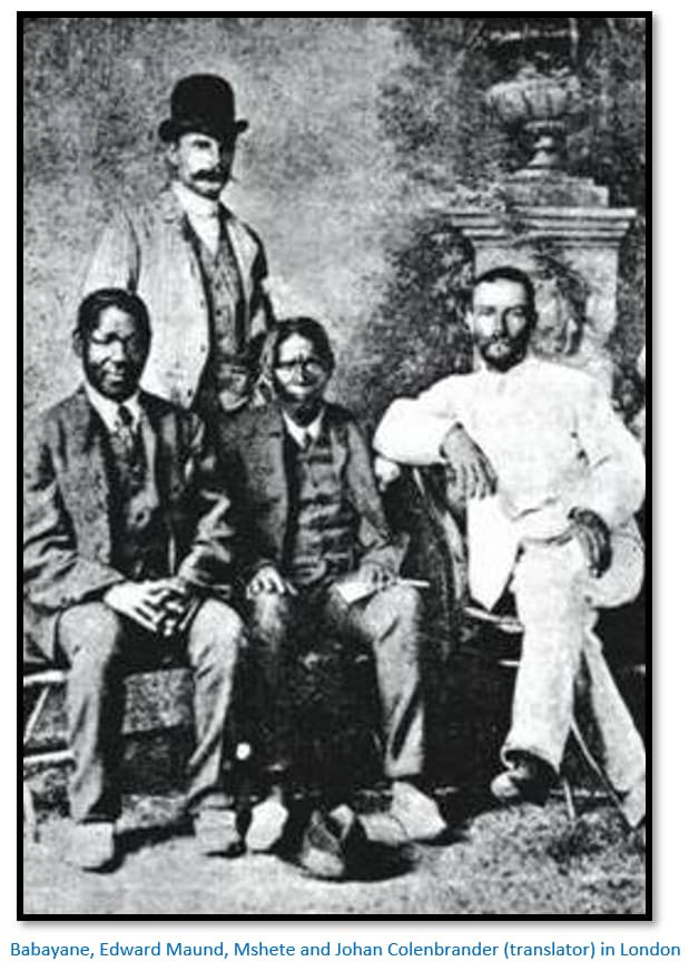 News of the document quickly spread and word began to filter back to Bulawayo of how it had been interpreted. The King, inundated with advice from his own indunas and subject to intrigue from Rhodes’ rivals, and the Boers especially, quickly decided that he had been duped. Lobengula, the other White men said, had just given away his country for nothing, and they came armed with a collection of newspaper clippings to prove their point. The Matabele King decided to dispatch two emissaries of his to go and see the Great White Queen in England to resolve the matter. The Boer’s complicity in this scheme is obvious, given that the two emissaries were not only allowed to travel through their lands but also on the inside of a mail coach, almost certainly the first two Blacks to ever do so in the Transvaal.