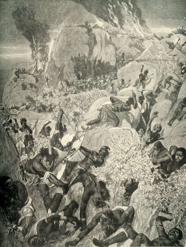 ‘We surrounded them and started to fight. They got off their horses and fired at us over them. All the horses were killed, and then the white men, those of them that were left, lay down behind the dead horses and fired at us. After many of the white men were killed, the few that were left, all of whom were wounded, lay on their backs and held their rifles between their feet and fired. After a little, the firing stopped, and we knew the cartridges were finished. We then rushed up and assegaied the remainder, who covered their eyes with their hands. We lost many more than the number of white men, for they were men indeed and fought us for many hours.’53