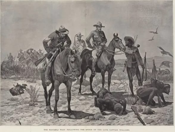 They had pushed their luck yesterday by stepping into the Matabele encampment and they were lucky to be alive. Now, however, it was a step too far. The bush suddenly lit up with rifle flashes and the Matabele seemed to be swarming absolutely everywhere. Within seconds two horses had been hit and a young trooper named William Britton had been shot in the face and horribly injured. The Matabele who had been so peaceable just moments beforehand, too, suddenly jumped into action and joined the wild ambush.