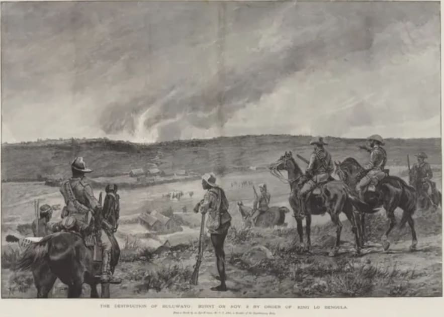 They set off again on the 2nd. The next day, as they approached Bulawayo, a huge explosion rocked the area and a column of smoke rose up from the capital. Lobengula had ordered his capital destroyed and his men had blown their magazine, a stock which consisted of 80,000 rounds of Martini Henry ammunition as well as 2,000 pounds of black powder.